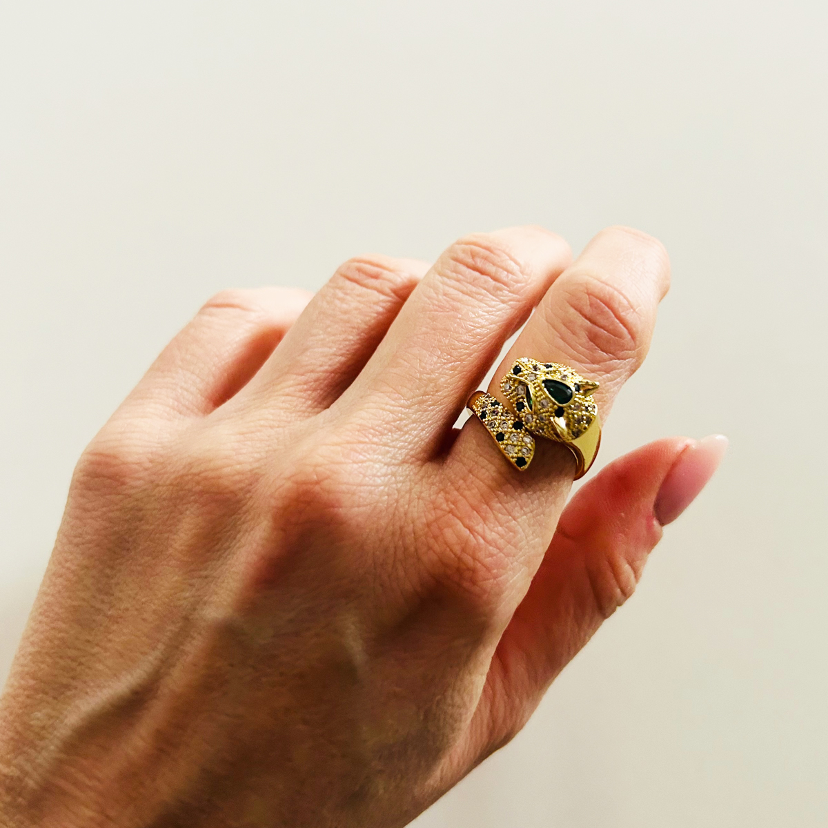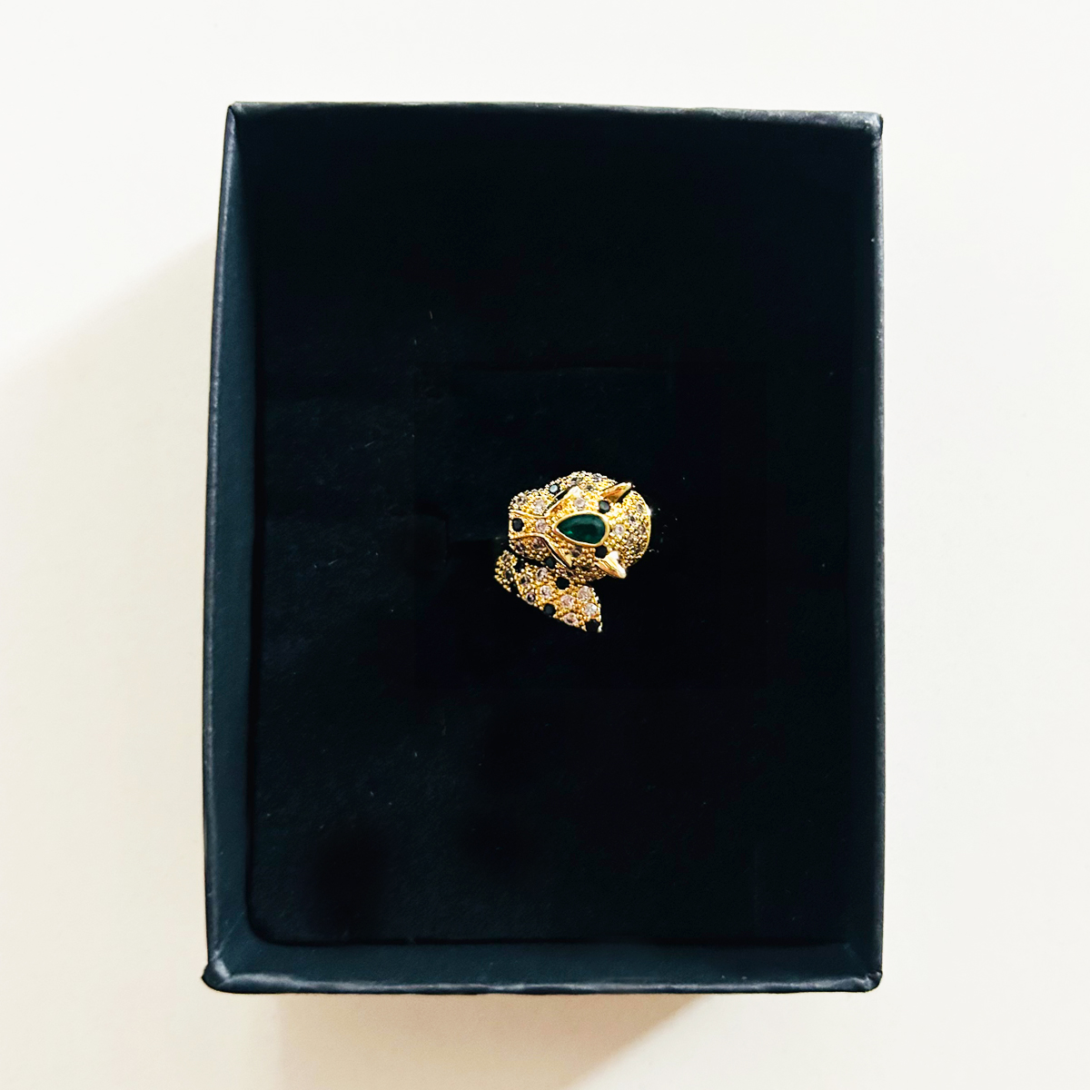 ANELLO A FORMA DI LEOPARDO IN OTTONE PLACCATO ORO 18K. LE PIETRE SONO IN ZIRCONIA CUBICA NEI COLORI CRYSTAL, NERO E VERDE SMERALDO. REGOLABILE.