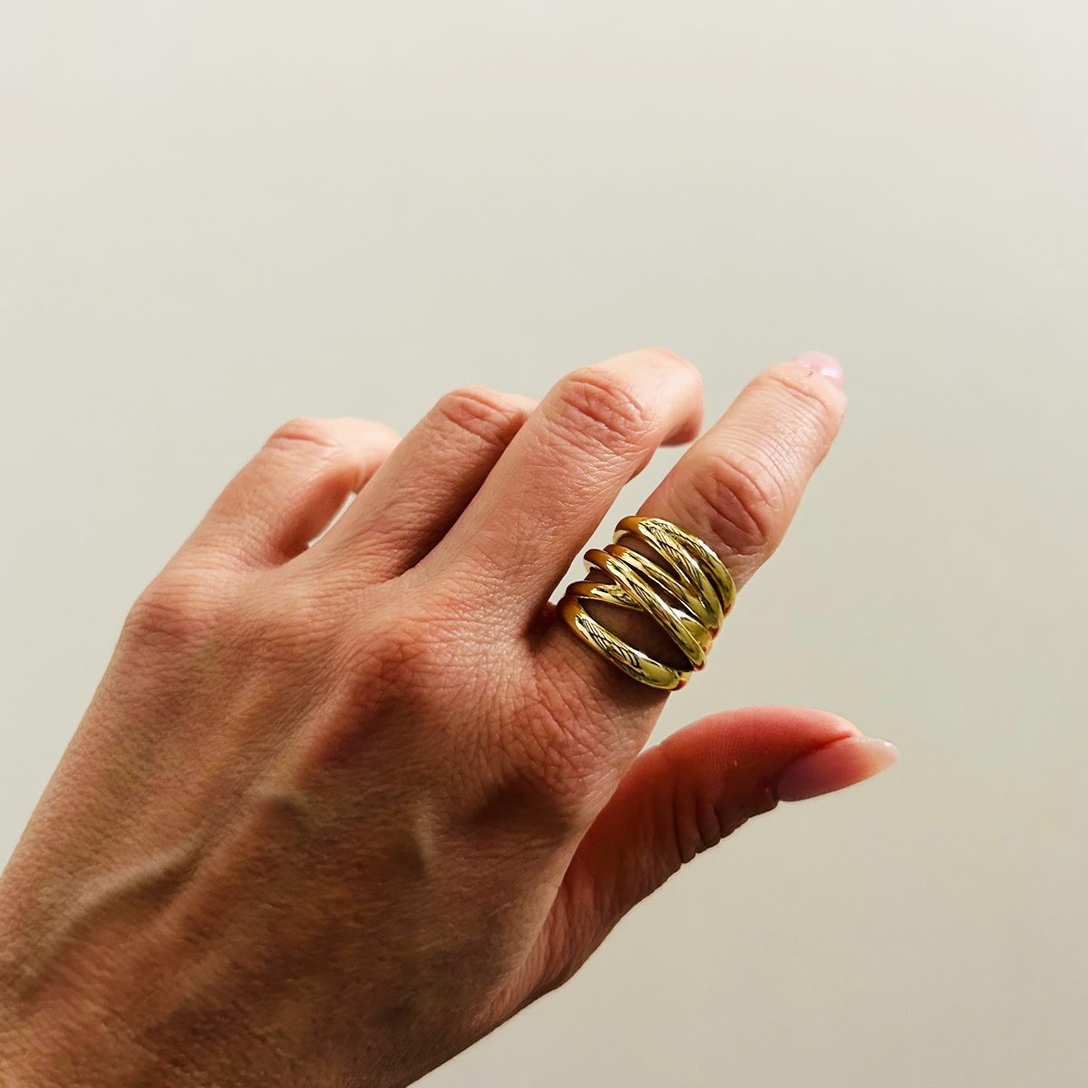 ANELLO MULTIFASCIA IN OTTONE, PLACCATO ORO 18K. REGOLABILE.