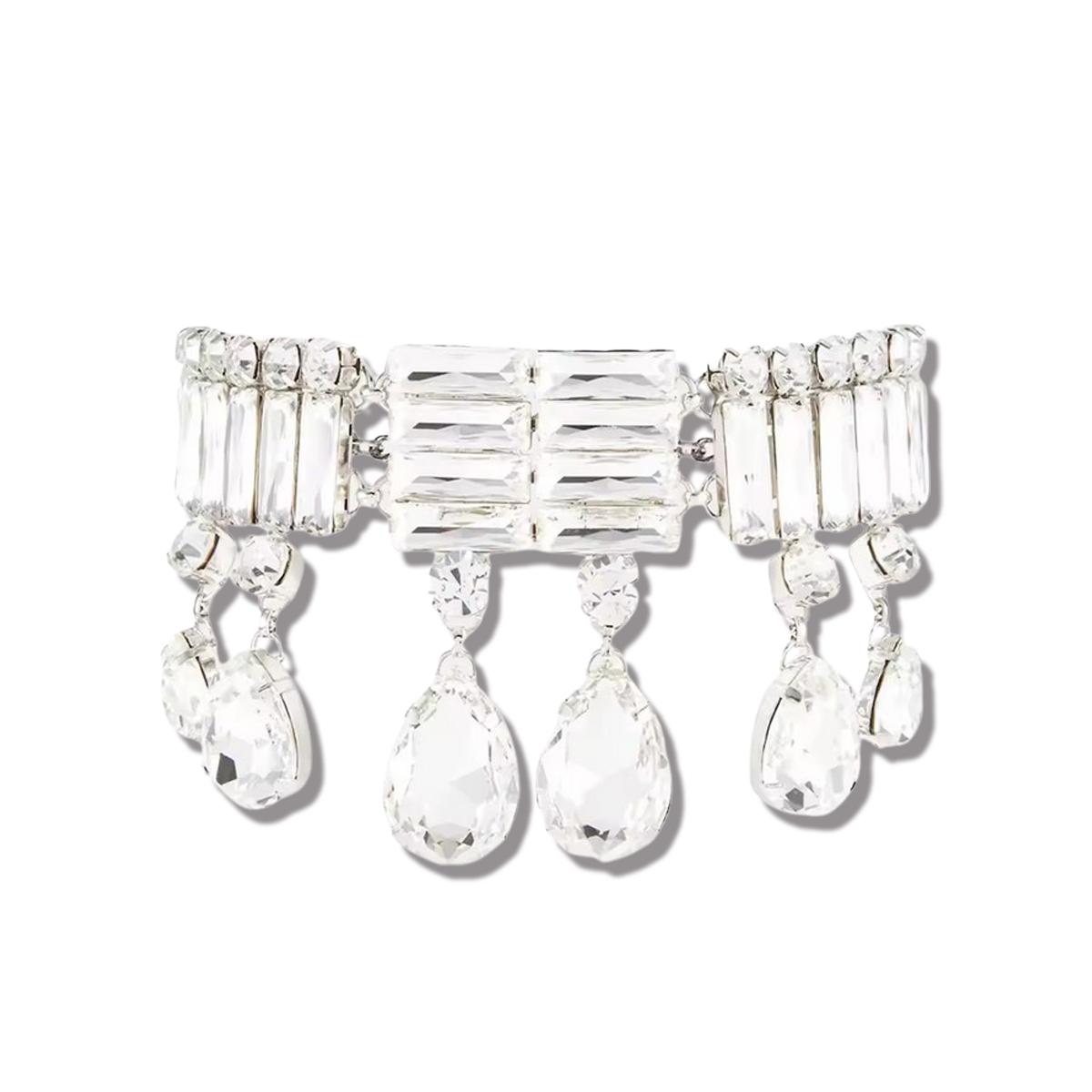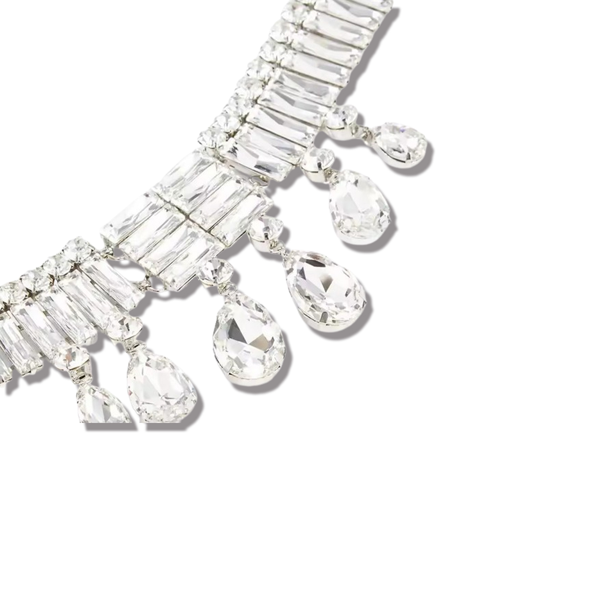 CHOKER CON PIETRE IN ZIRCONIA CUBICA DI GRANDI DIMENSIONI: TROVIAMO BAGUETTE, GEMME A BRILLANTE E GEMME A GOCCIA PENDENTI. REGOLABILE.