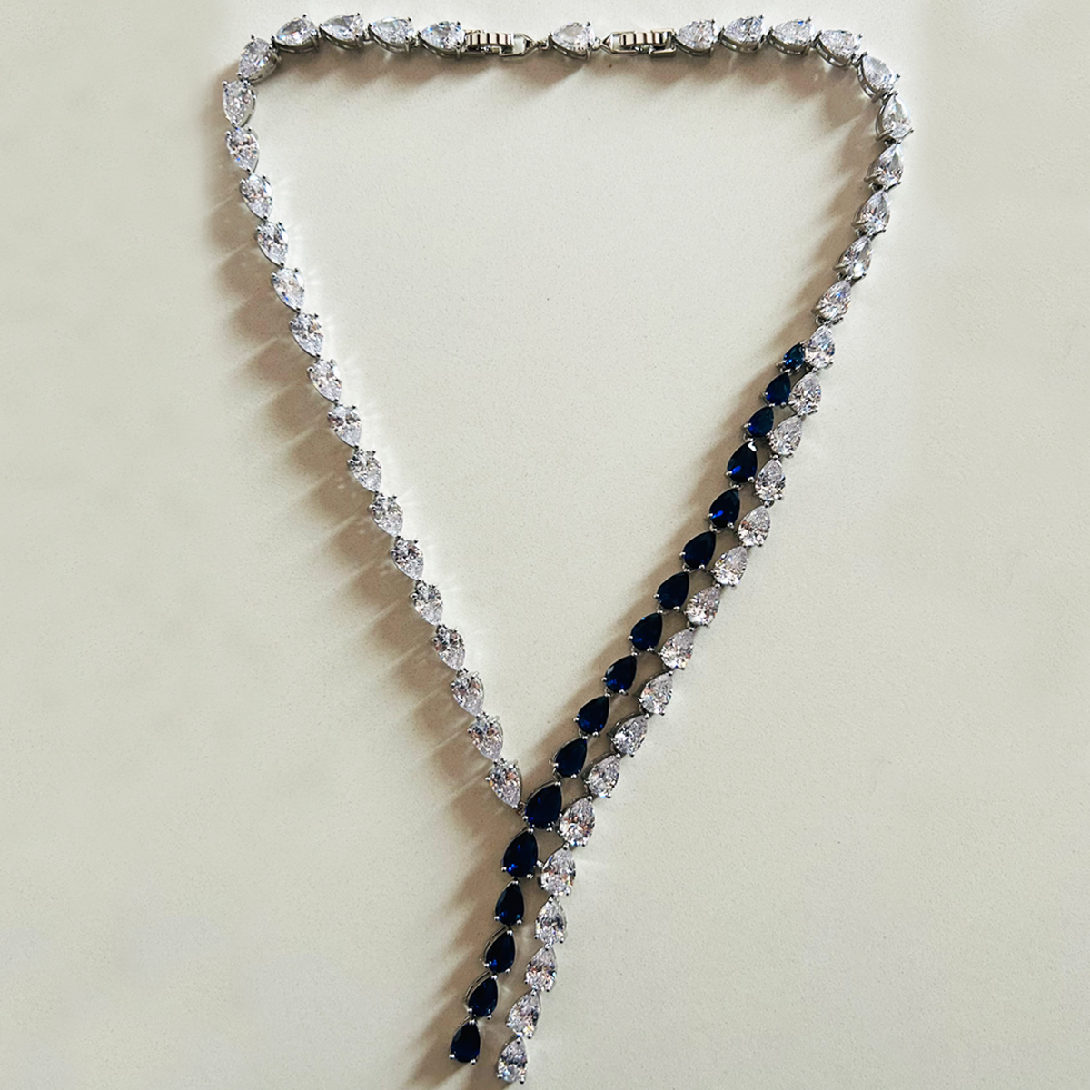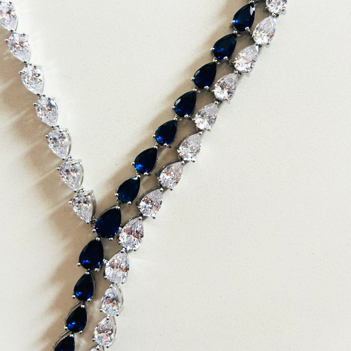 COLLIER CON CRISTALLI A GOCCIA COLOR CRYSTAL E COLOR ZAFFIRO. OTTONE PLACCATO PLATINO.