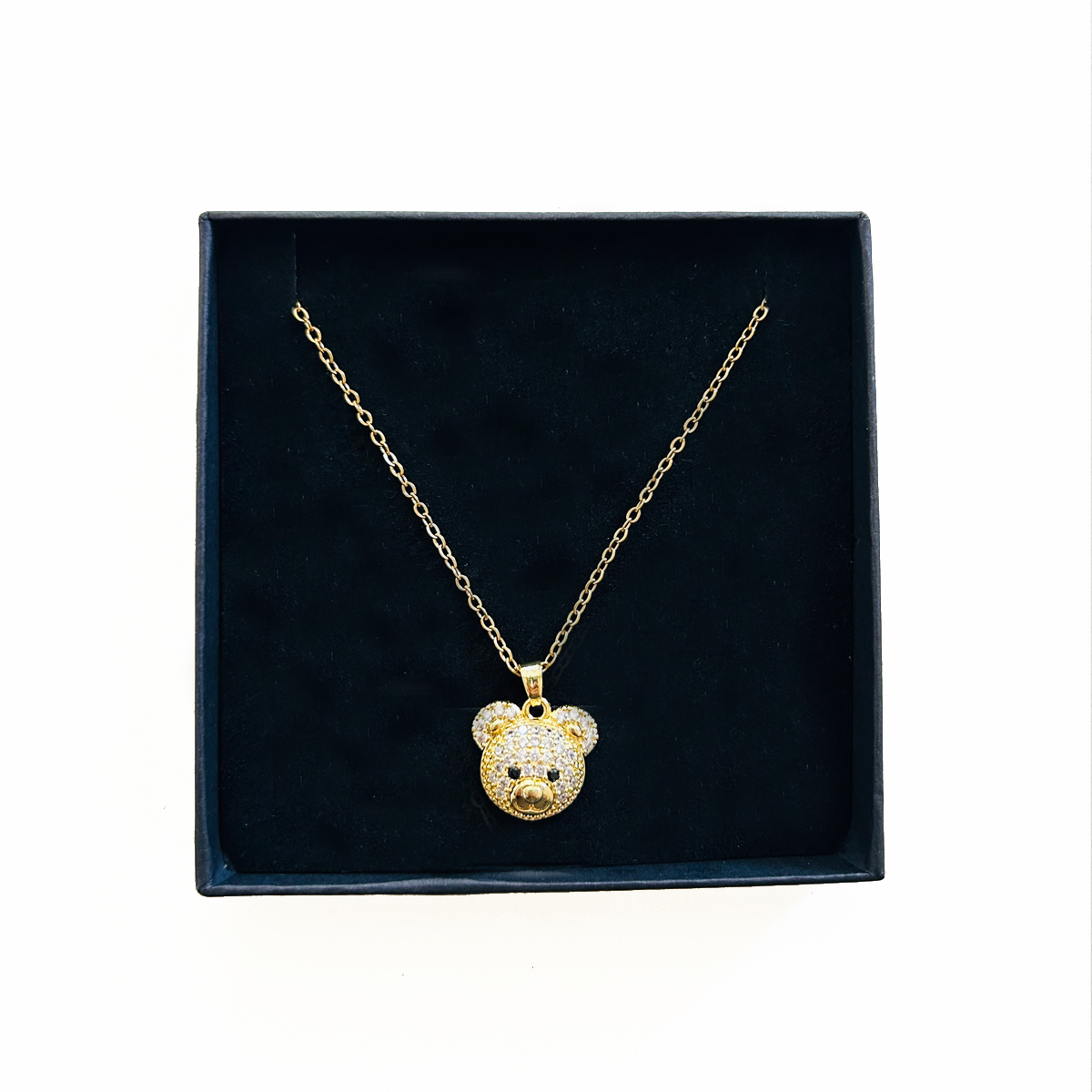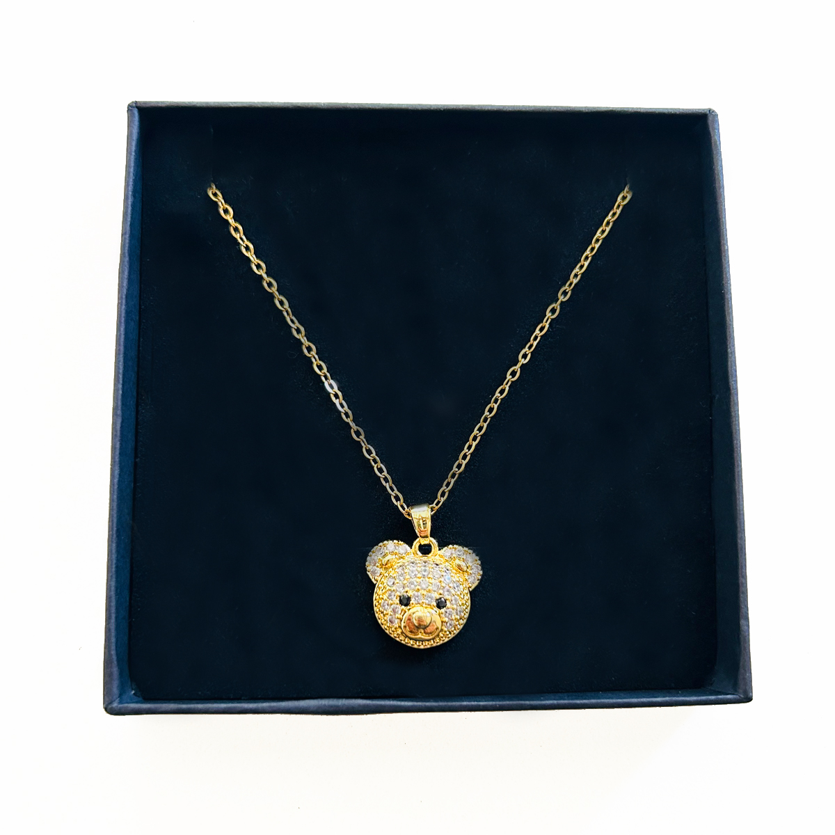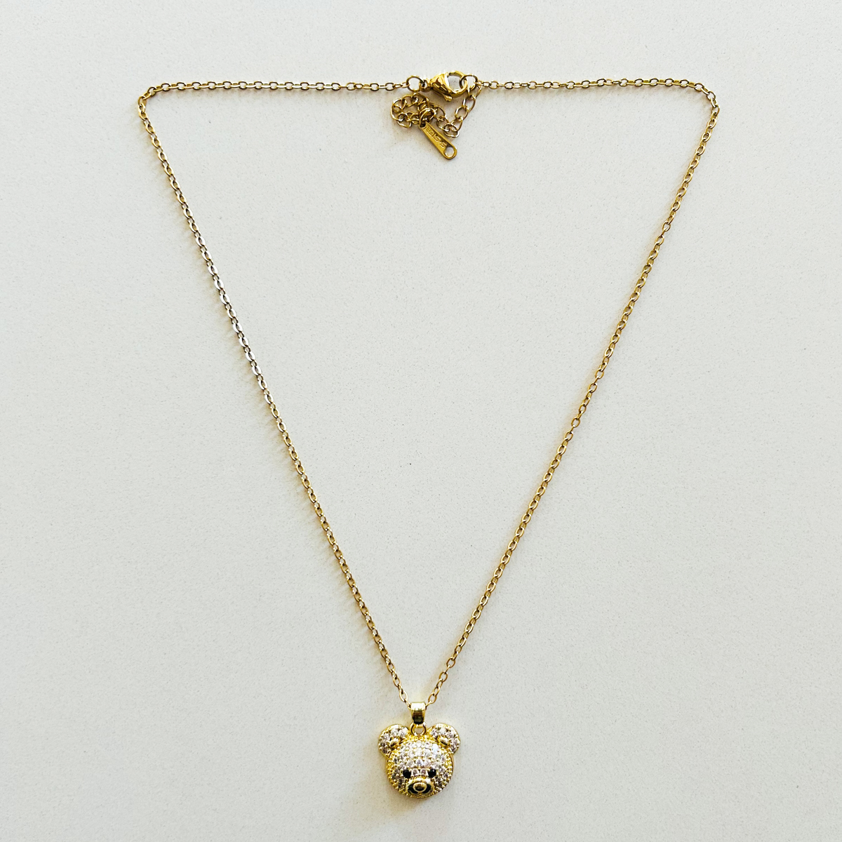 COLLANA IN ACCIAIO INOSSIDABILE CON CIONDOLO A FORMA DI VISO DI ORSETTO IN PAVè DI STRASS. CHIUSURA REGOLABILE.