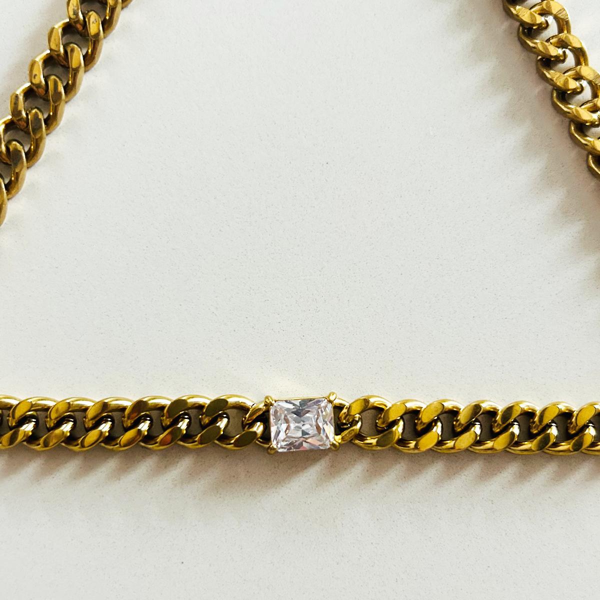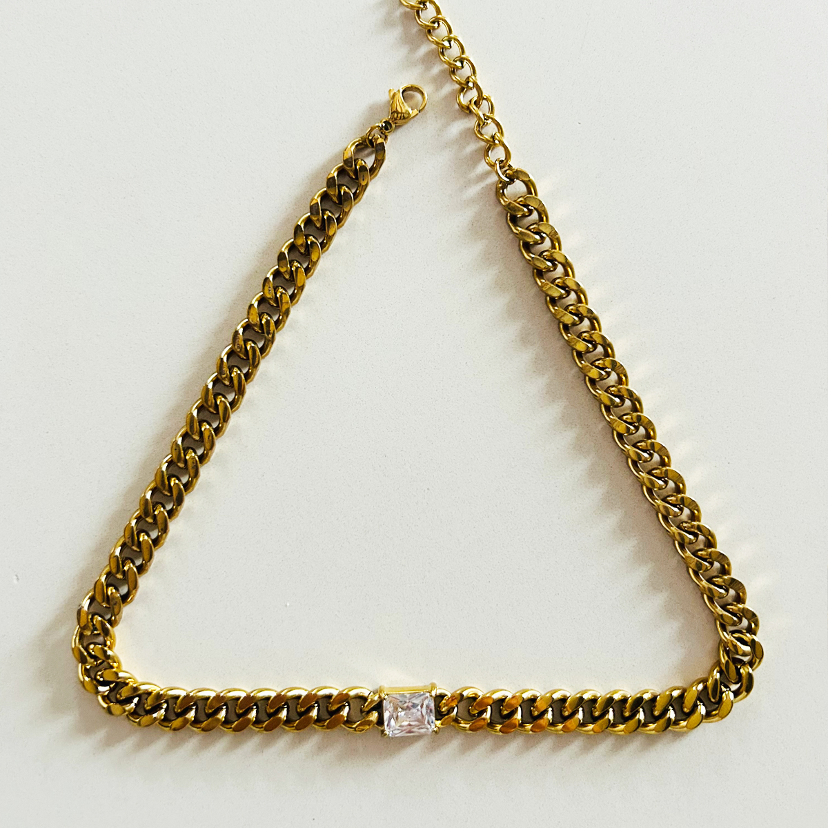 COLLANA IN ACCIAIO INOSSIDABILE 304, PLACCATO ORO 18K, CON PIETRA CENTRALE TAGLIO RETTANGOLO IN ZIRCONIA CUBICA. REGOLABILE.