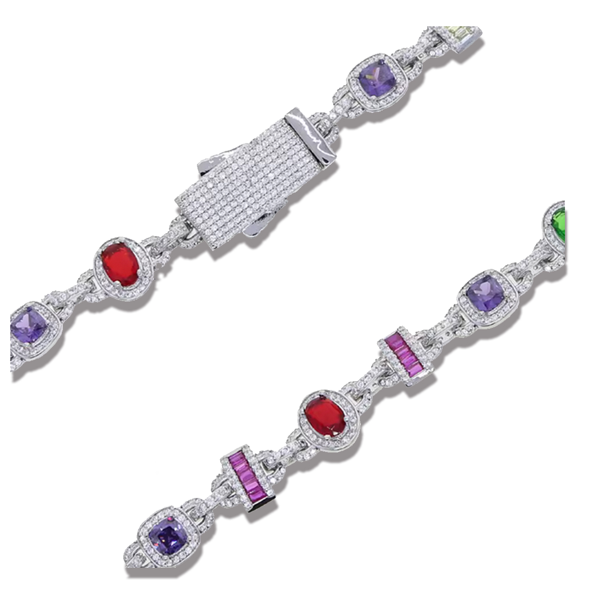 LE PAROLE D’ORDINE PER QUESTO COLLIER SONO COLORE E FORME, INFATTI SI ALTERNANO PIETRE DI COLORE E FORME DIVERSE CONTORNATE DA UN PAVè; TUTTO IN ZIRCONIA CUBICA. LA CHIUSURA è DI SICUREZZA, ANCH’ESSA IN PAVè DI ZIRCONIA CUBICA. LUNGHEZZA DA APERTA 46cm.