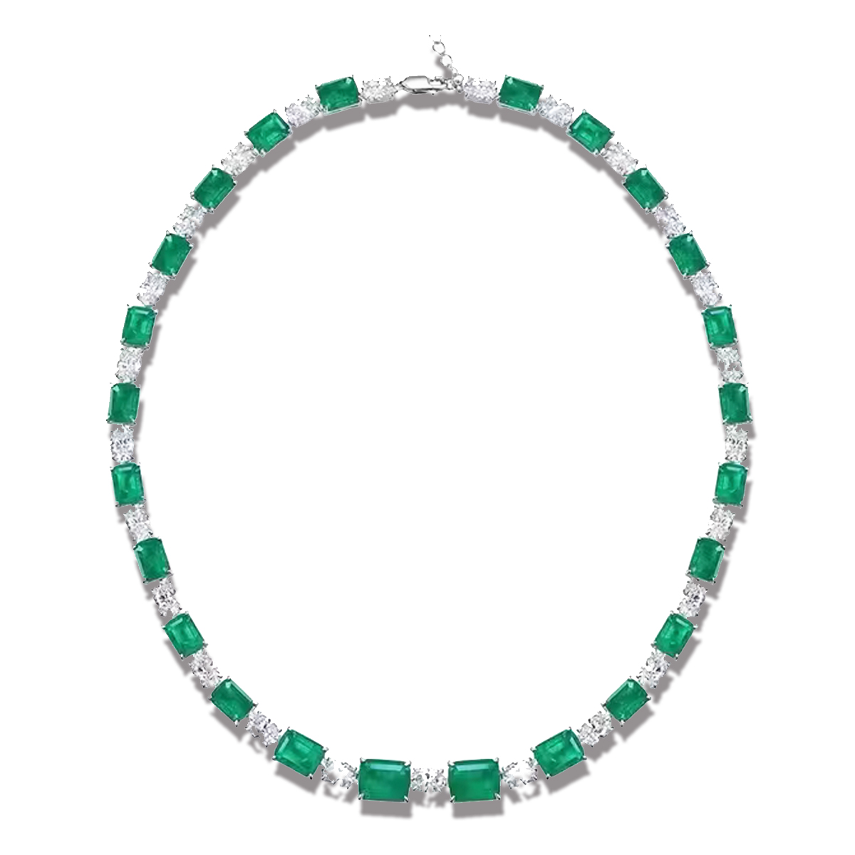 COLLIER CHE ALTERNA, IN DEGRADè, UNA GEMMA TAGLIO RETTANGOLO COLOR SMERALDO AD UNA GEMMA OVALE COLOR CRYSTAL, TUTTE IN ZIRCONIA CUBICA. CHIUSURA REGOLABILE. LUNGHEZZA DA APERTA 45cm.