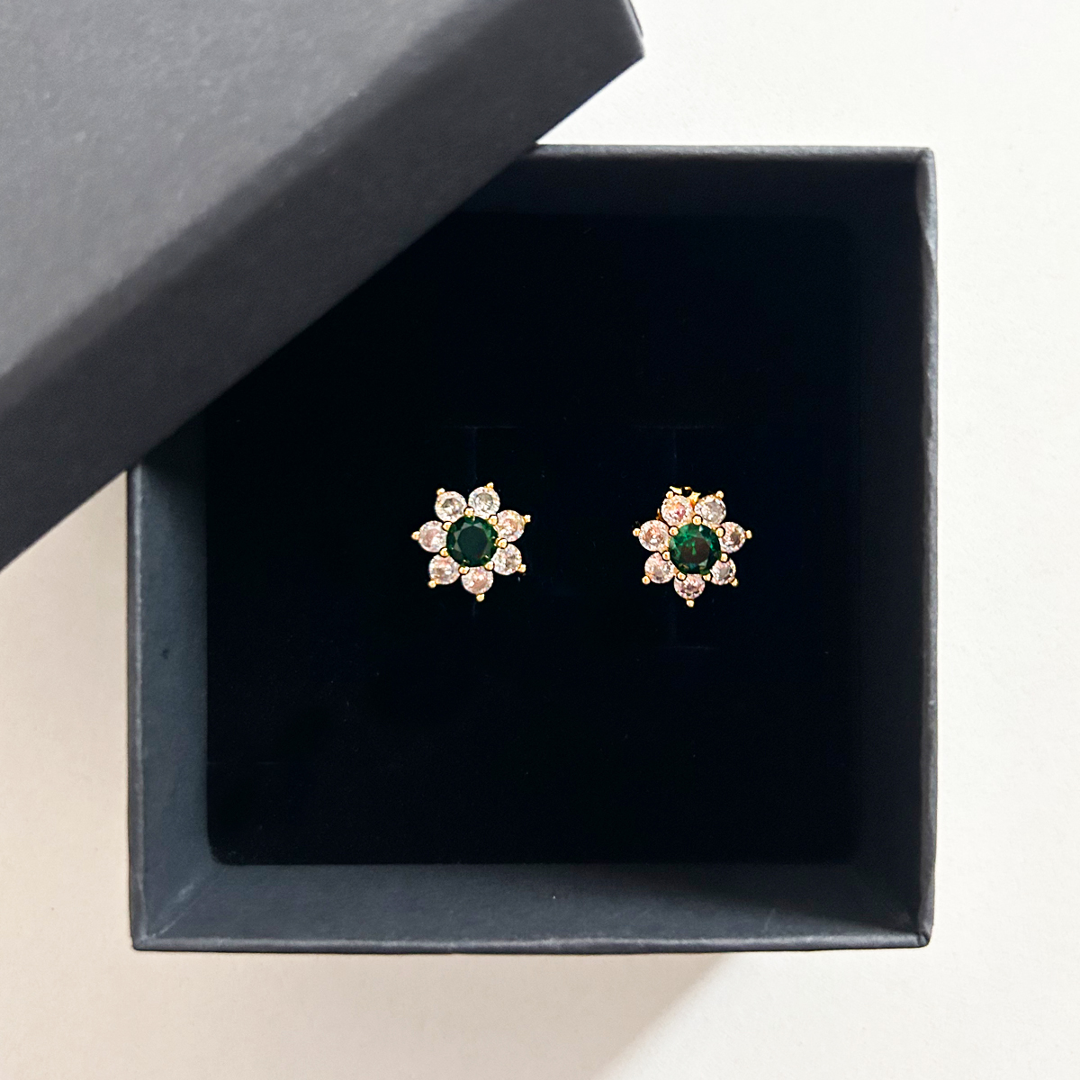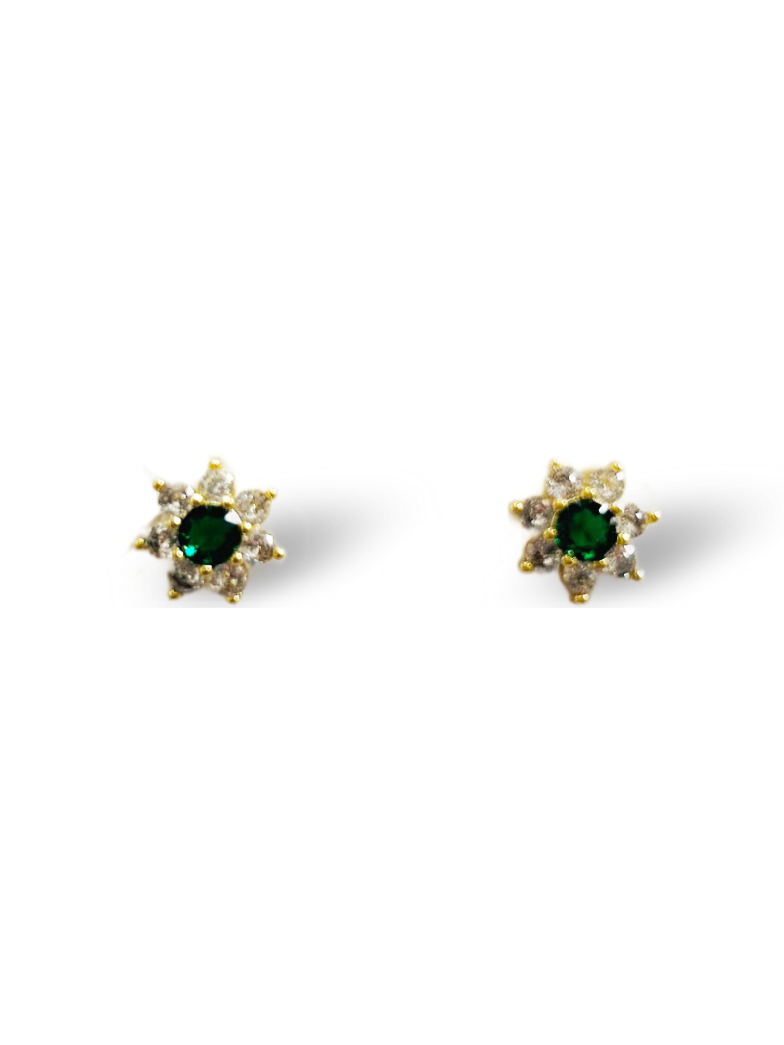 COPPIA DI ORECCHINI A FIORE IN ZIRCONIA CUBICA COLORATA CRYSTAL E VERDE SMERALDO.