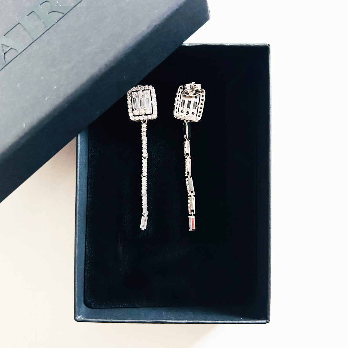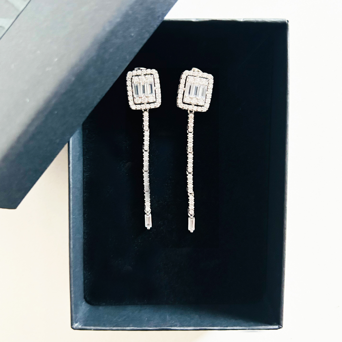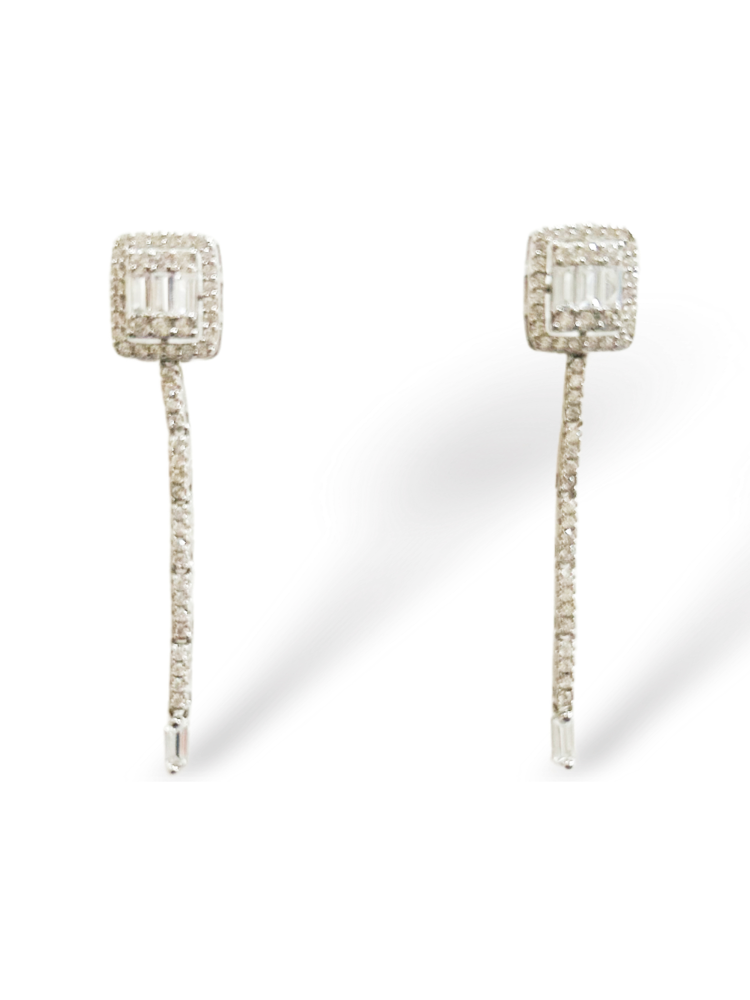 ORECCHINI IN ARGENTO 925 CON PARTE A LOBO IN PAVè DI ZIRCONI CUBICI E CON TRE BAGUETTE SEMPRE IN ZIRCONI CUBICI. FILO PENDENTE IN PAVè CON BAGUETTE FINALE IN ZIRCONI CUBICI.