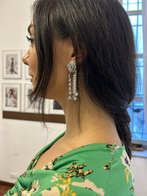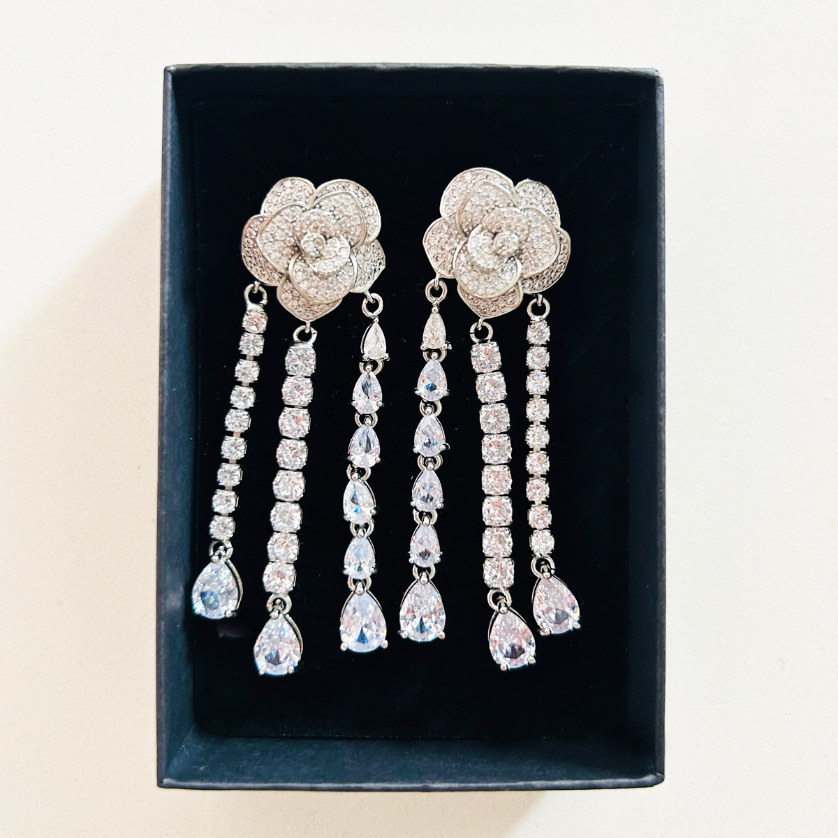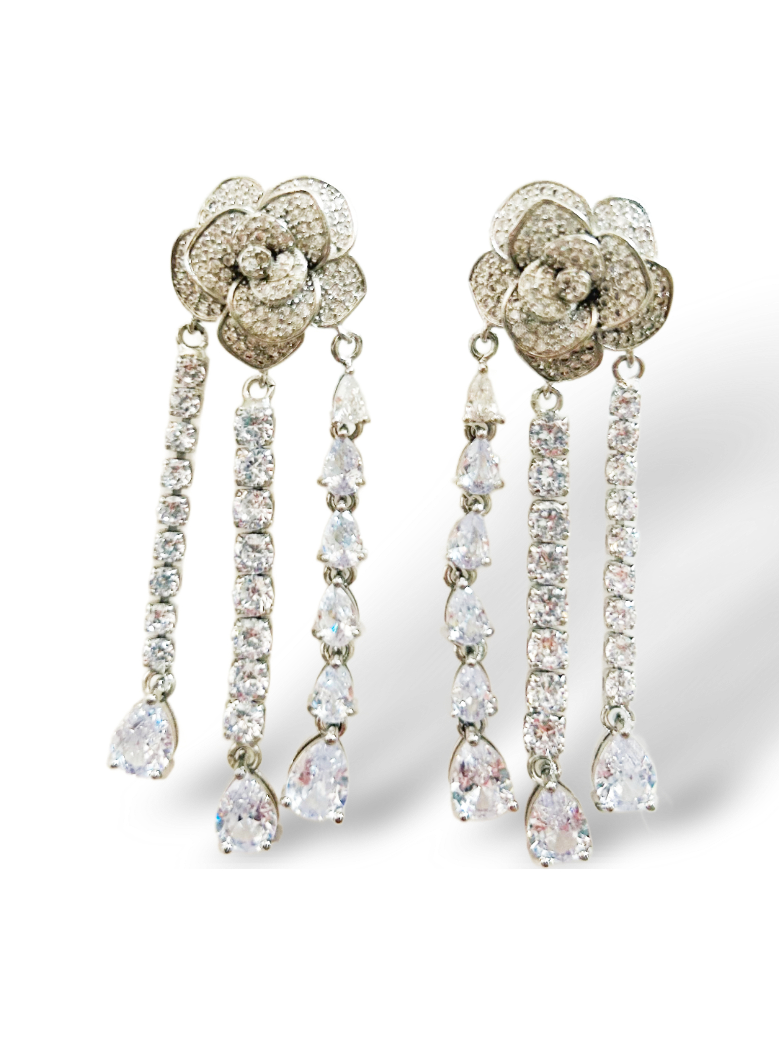 ORECCHINI CON CAMELIA A LOBO TUTTA IN PAVè DI ZIRCONIA CUBICA E TRE FILE DI PIETRE PENDENTI TAGLIO BRILLANTE E TAGLIO A GOCCIA IN ZIRCONIA CUBICA CRYSTAL. LUNGHEZZA TOTALE 68mm.
