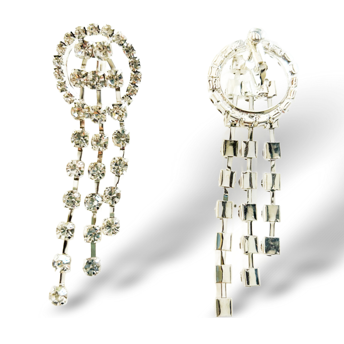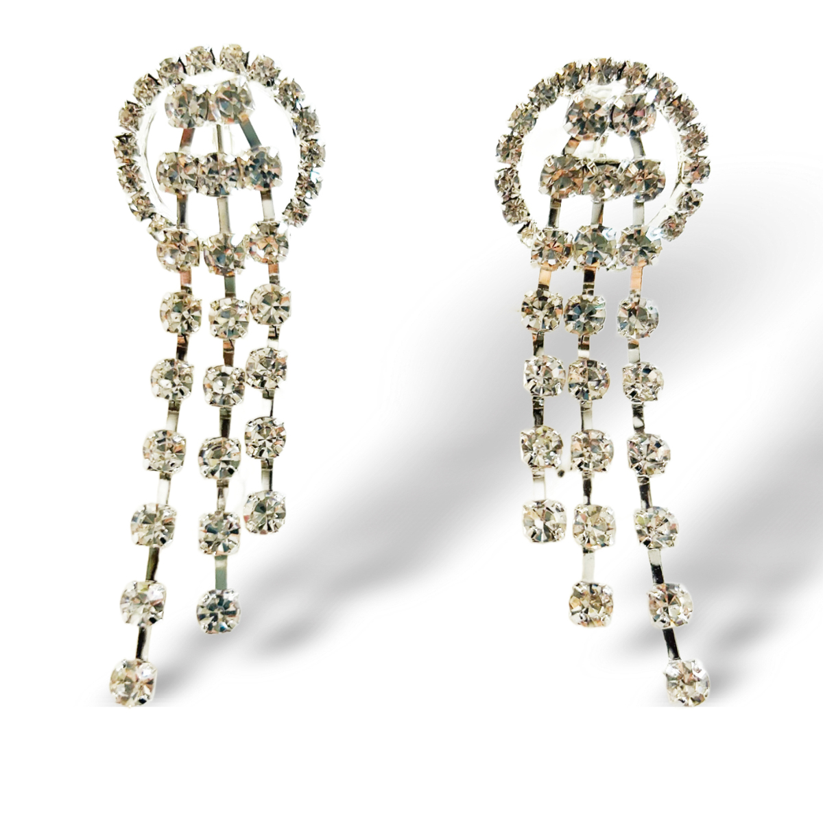 ORECCHINI CON CASCATA DI TRE PENDENTI IN CRISTALLO E MOTIVO TONDO A LOBO. BASE IN OTTONE, PIETRE IN ZIRCONIA CUBICA CRYSTAL.