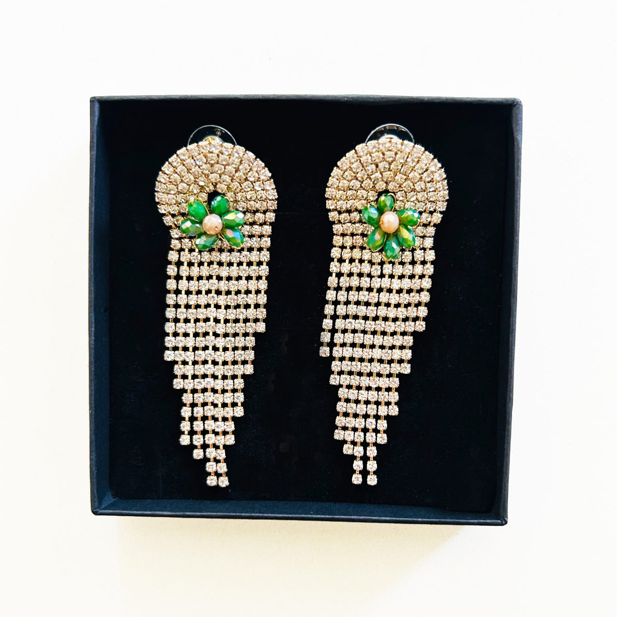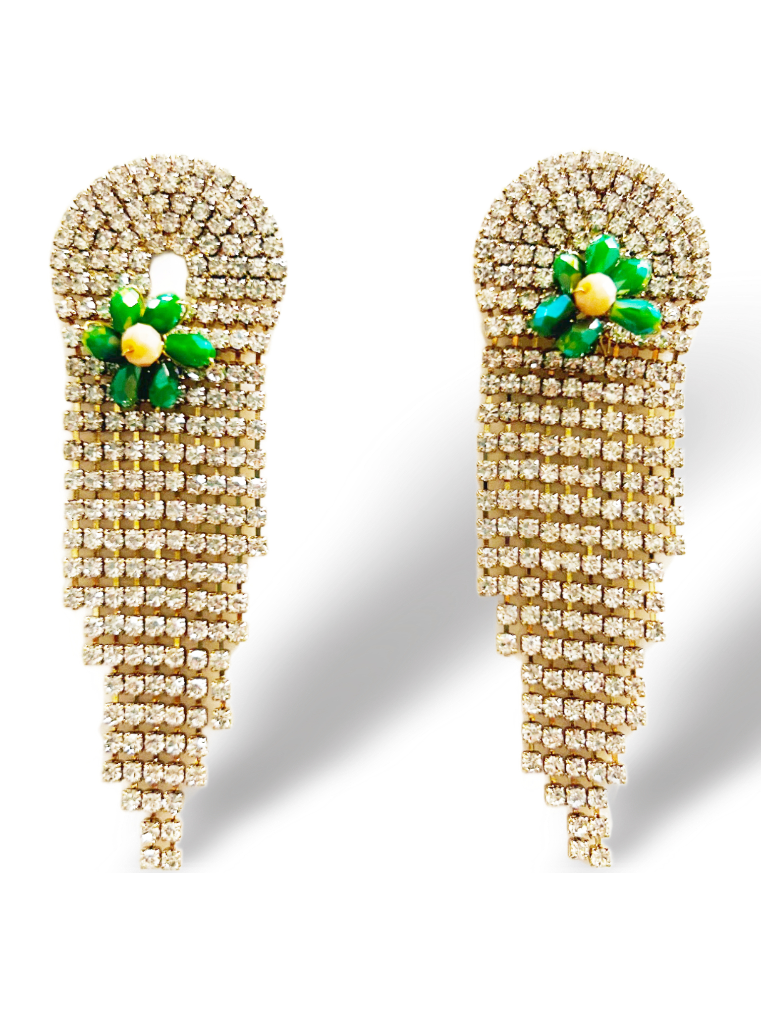 24,50 € ORECCHINI A CASCATA CON STRASS PENDENTI COLOR CRYSTAL E APPLICAZIONI DI FIORE IN PERLINE DI VETRO. DIMENSIONI: 75X25mm. Esaurito Category: ORECCHINI