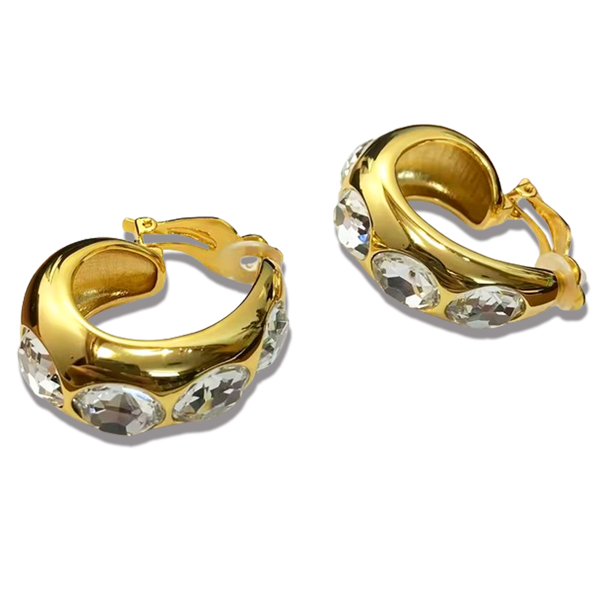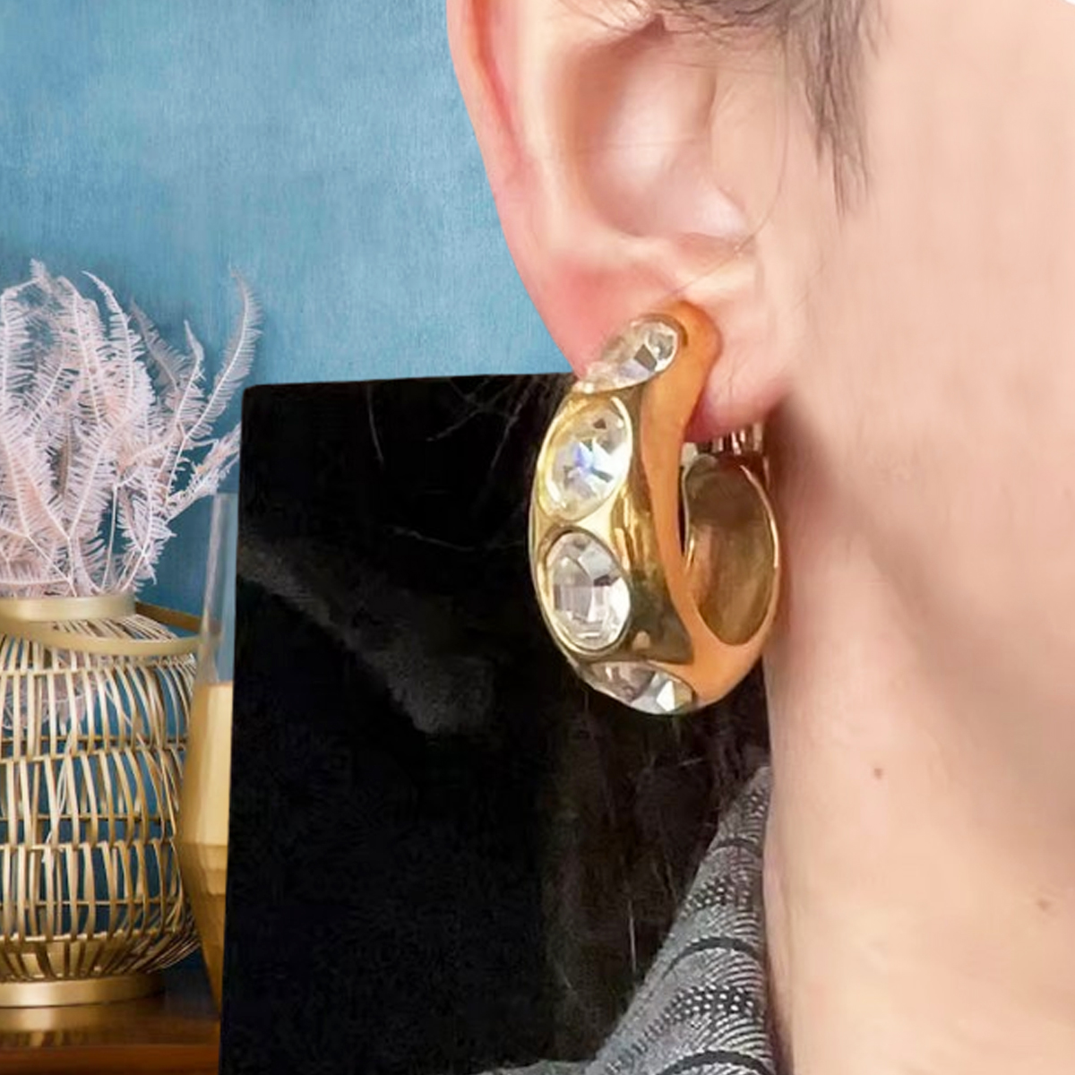 ORECCHINI A CERCHIO MOLTO SCENICI. LUNGO IL DISEGNO TROVIAMO INCASTONATE DELLE GEMME OVALI IN ZIRCONIA CUBICA COLOR CRYSTAL. CHIUSURA A CLIP.