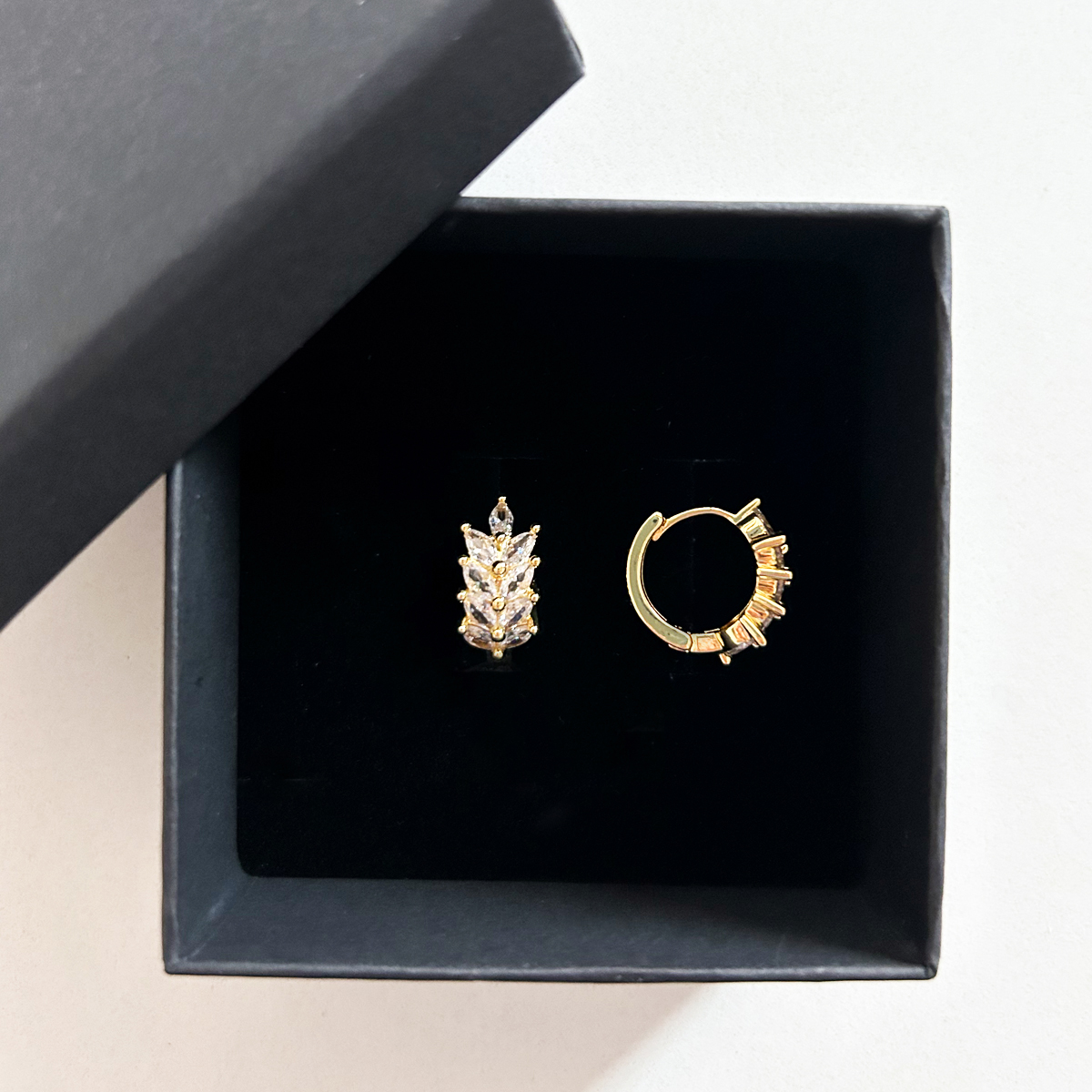 CERCHI IN OTTONE CON NAVETTE A PETALO IN ZIRCONI CUBICI TRASPARENTI.