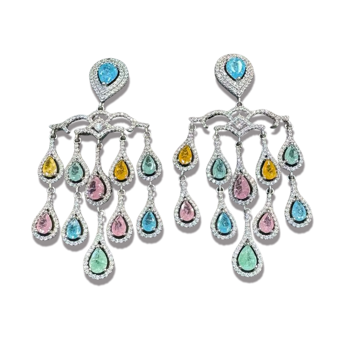 ORECCHINI CHANDELIER IN ARGENTO 925. A LOBO TROVIAMO UNA GEMMA A GOCCIA CELESTE CONTORNATA DA DUE FILE DI PAVè, DALLA QUALE PARTE TUTTO UN MOTIVO A CASCATA IN PAVè E PIETRE A GOCCIA COLOR PASTELLO. TUTTE LE GEMME SONO IN ZIRCONIA CUBICA. CHIUSURA A PERNO. LUNGHEZZA ORECCHINI 7cm.