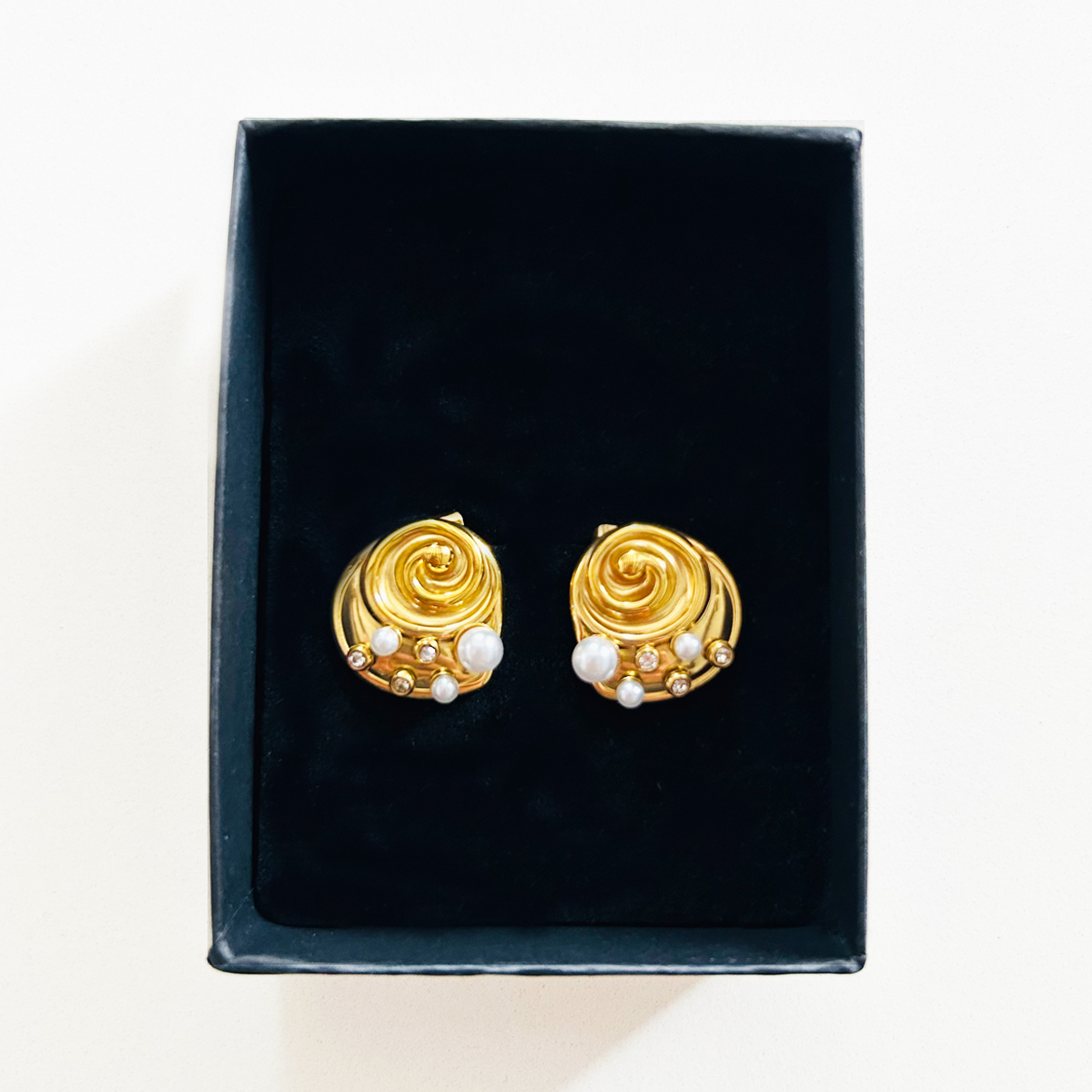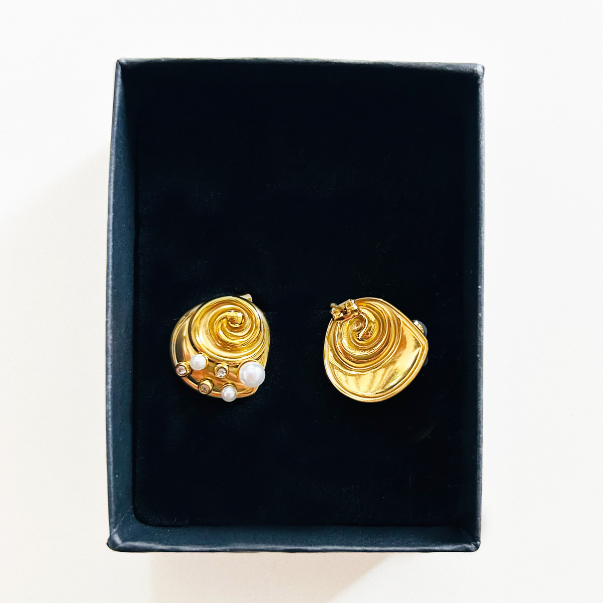 ORECCHINI A BOTTONE IN ACCIAIO INOSSIDABILE 304, A FORMA DI CONCHIGLIA CON APPLICAZIONI DI PIETRE CRYSTAL IN ZIRCONIA CUBICA E DI PERLE IN RESINA.
