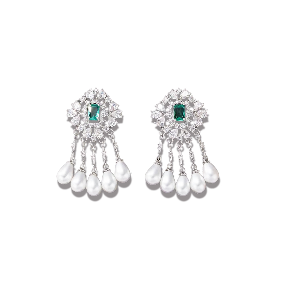 ORECCHINI CON GEMME A LOBO DI VARIE FORME IN ZIRCONIA CUBICA CRYSTAL E PIETRA CENTRALE COLOR SMERALDO, TAGLIO RETTANGOLO SEMPRE IN ZIRCONIA CUBICA. PERLE A GOCCIA IN RESINA COME PENDENTI.