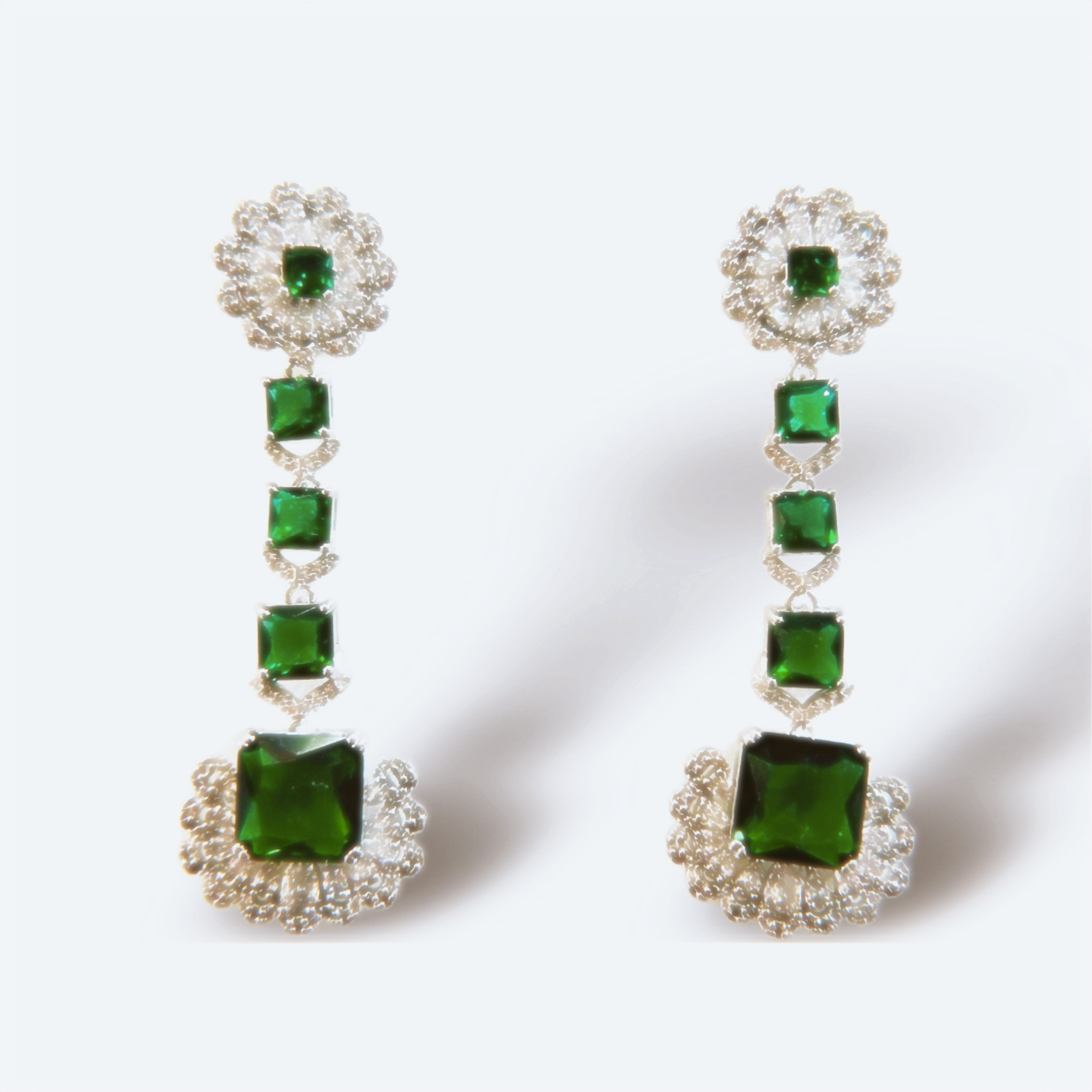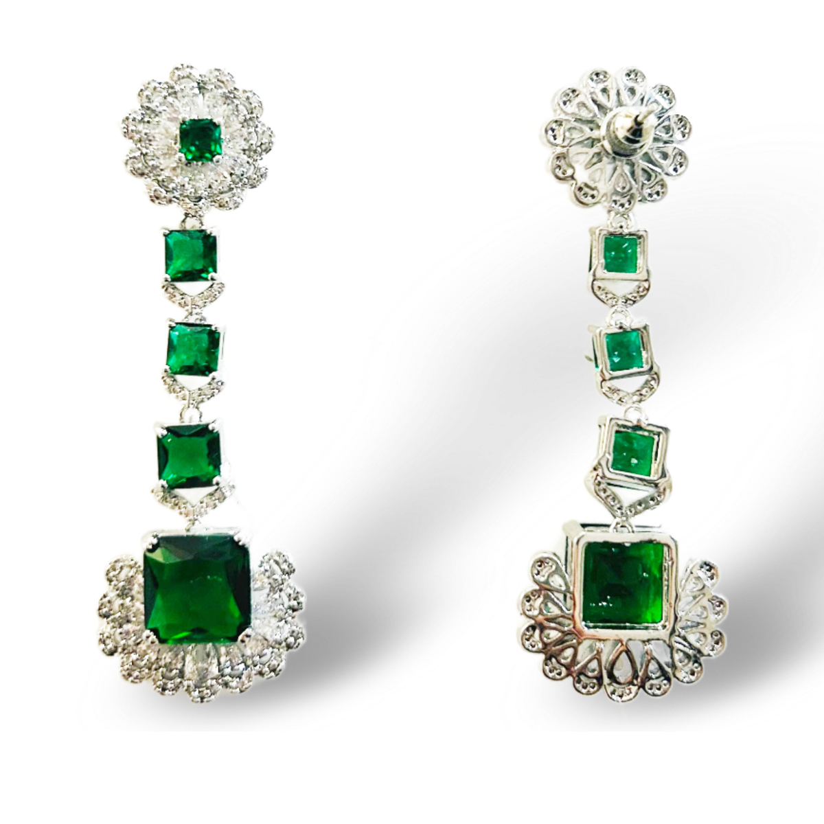 ORECCHINI PENDENTI CON PIETRE DEGRADè TAGLIO QUADRATO , COLOR SMERALDO IN ZIRCONIA CUBICA. NELLA PARTE A LOBO E NELLA PARTE TERMINALE TROVIAMO UN MOTIVO DI PIETRE CRYSTAL IN ZIRCONIA CUBICA.