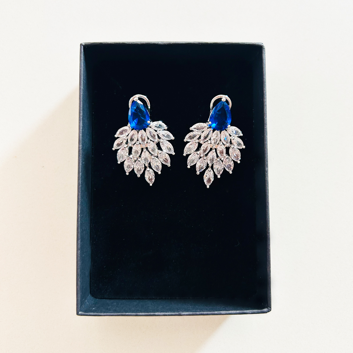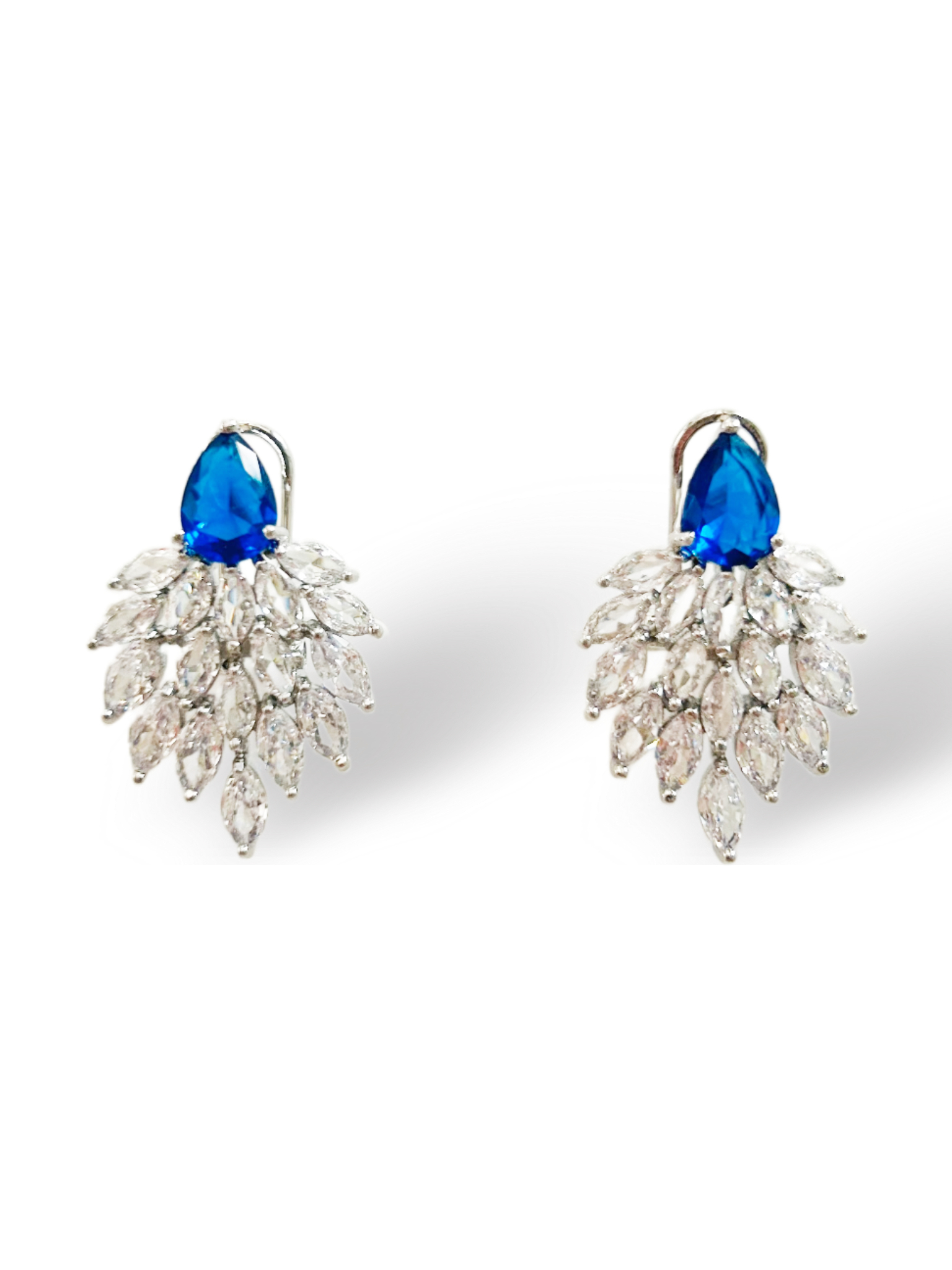 ORECCHINI A BOTTONE CON PIETRA A LOBO A GOCCIA COLOR ZAFFIRO, DALLA QUALE PARTE UNA CASCATA DI GEMME A NAVETTA CRYSTAL. TUTTO ZIRCONIA CUBICA. 35X23mm.
