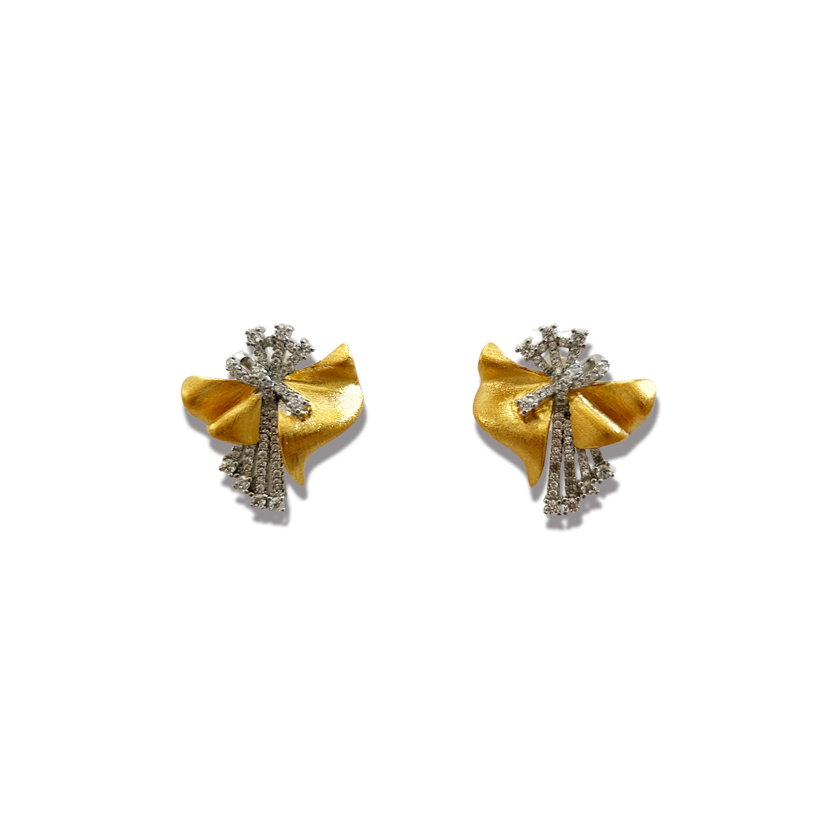 ORECCHINI A FORMA DI FIOCCO IN STILE VINTAGE, PLACCATI IN ARGENTO. IL FIOCCO HA UNA LAVORAZIONE COME “SPAZZOLATA”; NEL MEZZO TROVIAMO UN NODO DI PIETRE IN ZIRCONIA CUBICA CRYSTAL. CHIUSURA A PERNO.