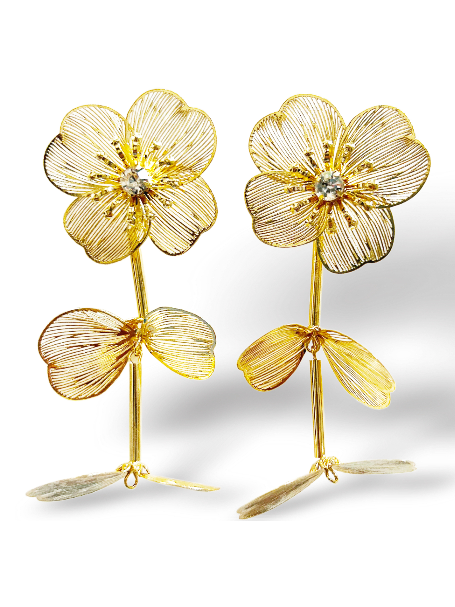 ORECCHINI CON FIORE A LOBO FILIGRANATO E FOGLIE PENDENTI FILIGRANATE; A LOBO NEL CENTRO TROVIAMO UNO STRASS CRYSTAL.