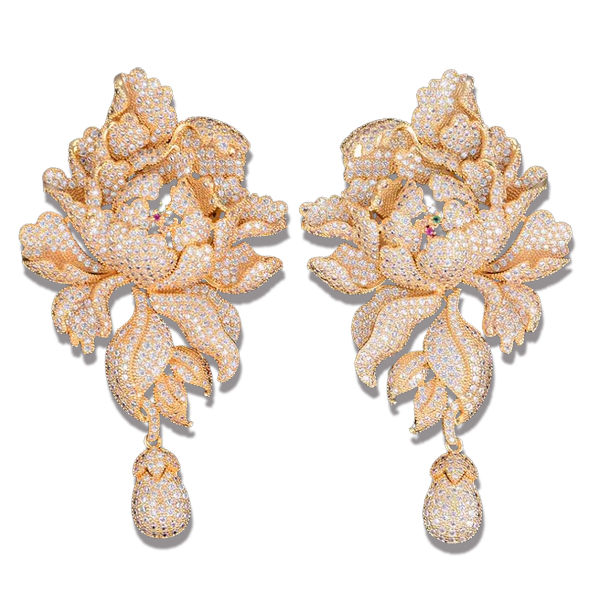 ORECCHINI CON BASE COLOR ORO A FORMA DI FIORE DI PEONIA TUTTI IN PAVè IN ZIRCONIA CUBICA. QUESTO GIOIELLO SI COMPONE DI DUE MODULI MOBILI CH GLI DONANO UN BEL MOVIMENTO DI LUCE. CHIUSURA A PERNO. LUNGHEZZA ORECCHINO 76 mm.