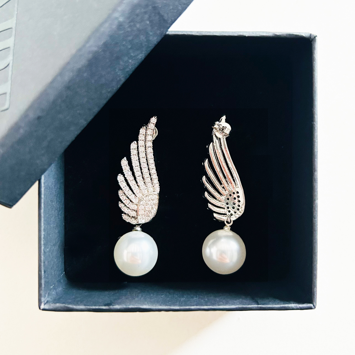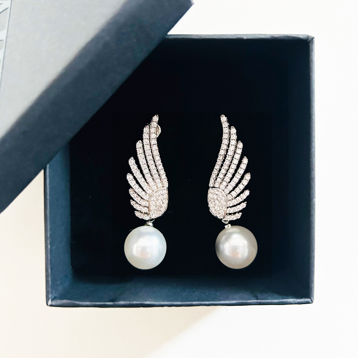 ORECCHINI A FORMA DI ALA IN PAVè DI ZIRCONI CUBICI, CON PIETRA A PERLA PENDENTE.