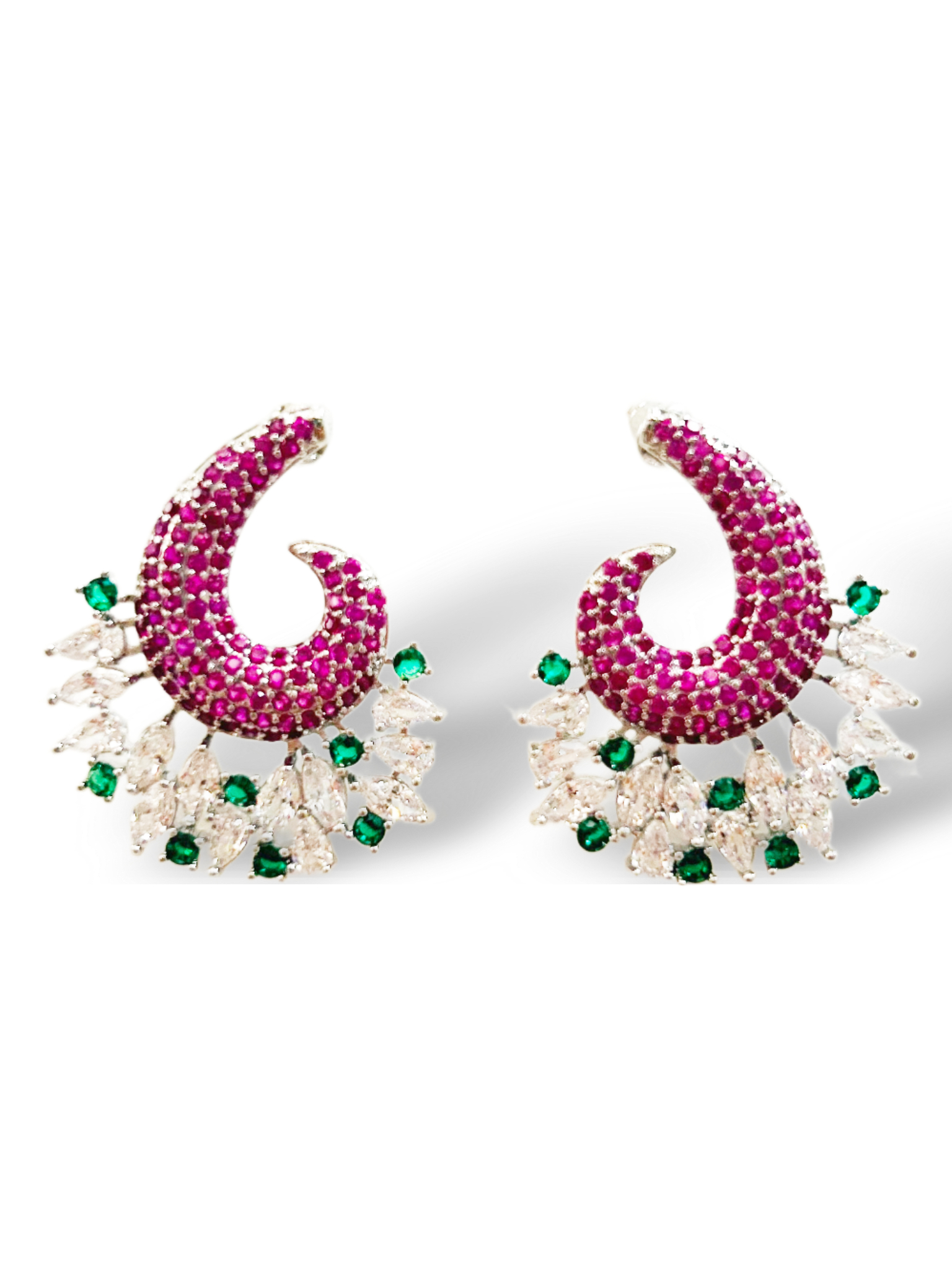 ORECCHINI A LOBO CHE PRESENTANO SULLA BASE UN PAVè IN ZIRCONIA CUBICA COLOR RUBINO, MENTRE LUNGO TUTTO IL CONTORNO VI SONO DELLE PIETRE A NAVETTA COLOR CRYSTAL E DELLE PIETRE TAGLIO BRILLANTE COLOR SMERALDO; TUTTO ZIRCONIA CUBICA. 38X30mm.
