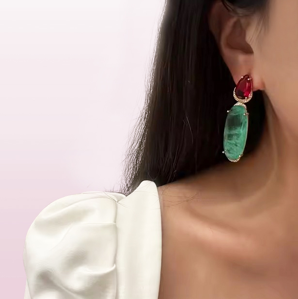 ORECCHINI PENDENTI COLORATI IN RAME PLACCATO ORO. A LOBO TROVIAMO UNA GEMMA A GOCCIA IN VETRO COLOR AMARENA E COME PENDENTE UNA GEMMA OVALE IN VETRO COLOR VERDE SMERALDO E CHE PRESENTA ANCHE LE CLASSICHE INCLUSIONI CARATTERISTICHE DELLO SMERALDO. IL PAVè è IN ZIRCONIA CUBICA. LUNGHEZZA 62mm. CHIUSURA A PERNO.