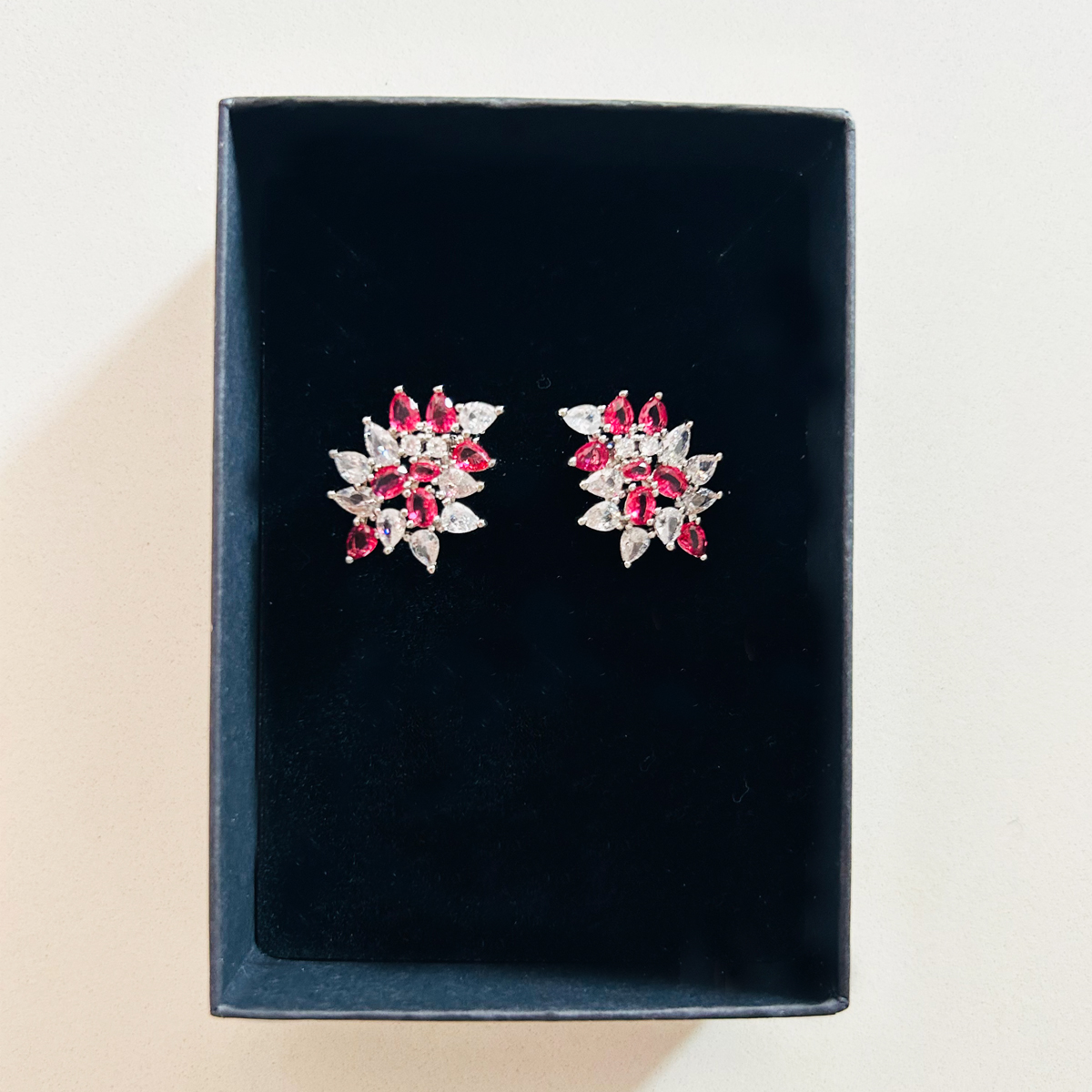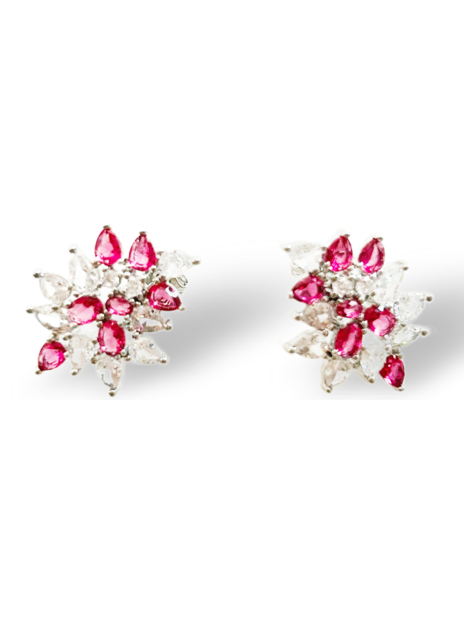 ORECCHINI A LOBO MOLTO ELEGANTI CON GEMME A GOCCIA E A BRILLANTE COLOR RUBINO E CRYSTAL. TUTTO ZIRCONIA CUBICA. 20X25mm.