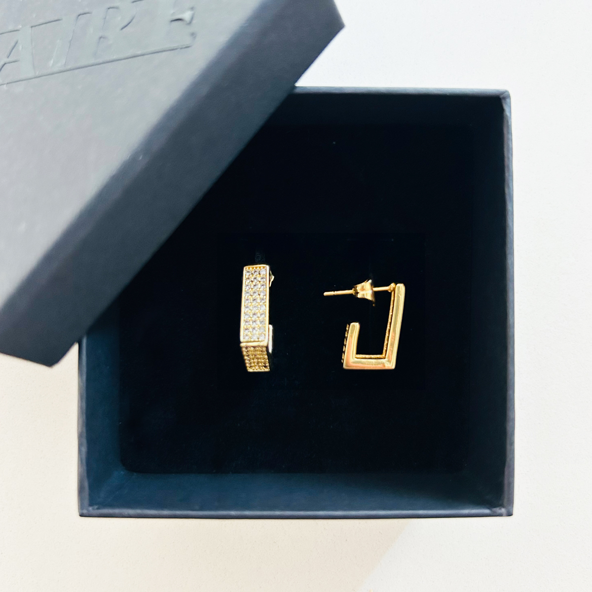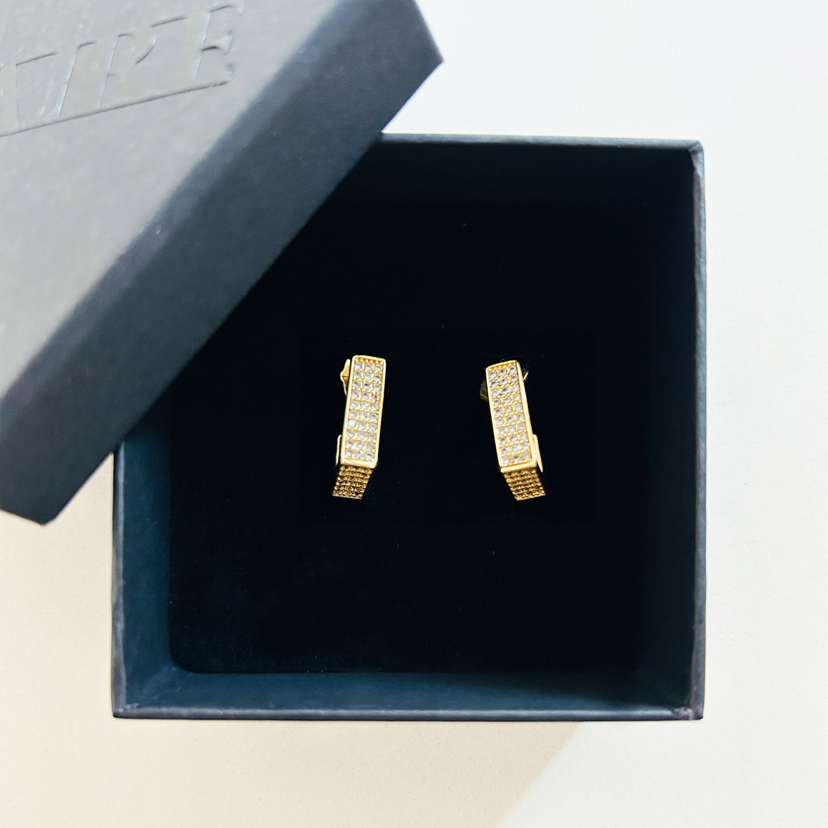 ORECCHINI SQUADRATI IN OTTONE PLACCATO ORO 18K, CON PAVè IN ZIRCONI.